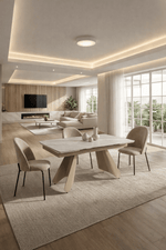 La struttura in ferro verniciato colore champagne dona al tavolo un aspetto sofisticato e leggero, creando un armonioso contrasto con il top effetto marmo. Il design della base, solido e moderno, garantisce stabilità e carattere all’intera composizione.